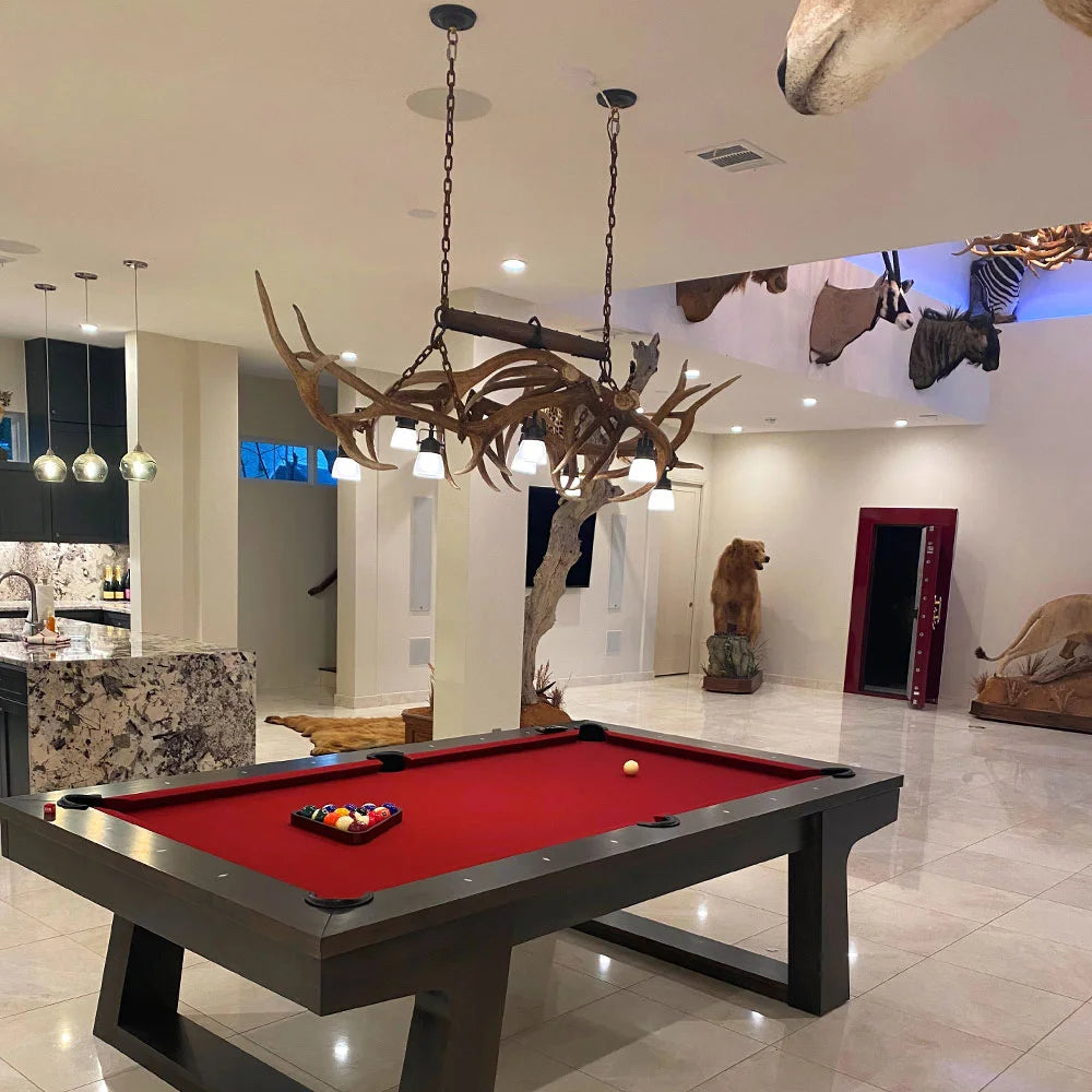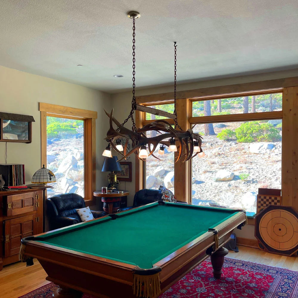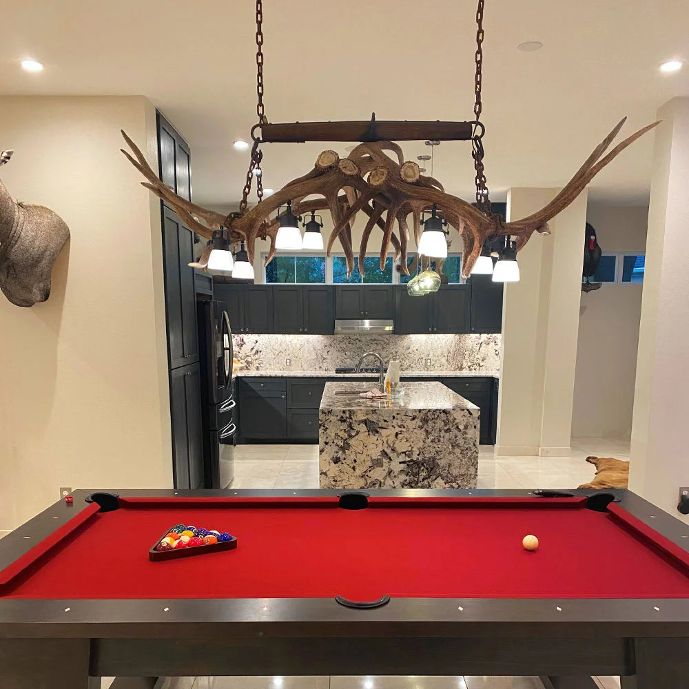 This piece is made just like our Elk Antler Pool Table Light with a beautiful addition of the antique “single tree”. So, whether you’re in the market for a statement-making dining room light, a conversation piece to hang over the pool table or the bar, this exquisite piece will suit all your needs. Expertly crafted using six carefully selected mature bull elk antler sheds; illuminated using eight halogen lights. This beauty will spark conversation just as easily as it brightens the whole space. This fixture features hidden, internal wiring and weighs between 45 and 55 pounds. It measures approximately 25”- 30” tall, 26"- 34"” wide, and 65” - 75” long. Each light is a custom-made piece so it will vary slightly from the pictures, built upon order. Please allow 4-8 weeks from time of order processing to time of delivery. Shipping price includes custom-built wooden crate and delivery to anywhere in the continental U.S.
